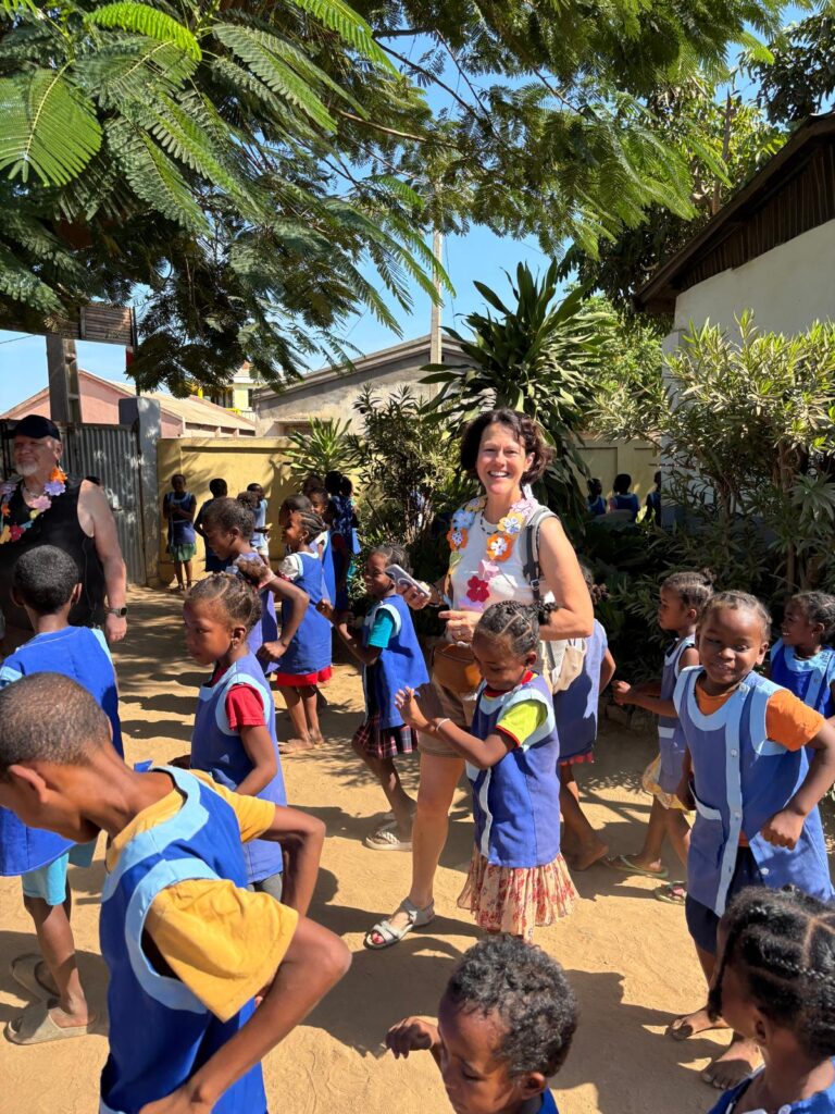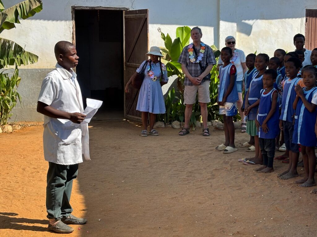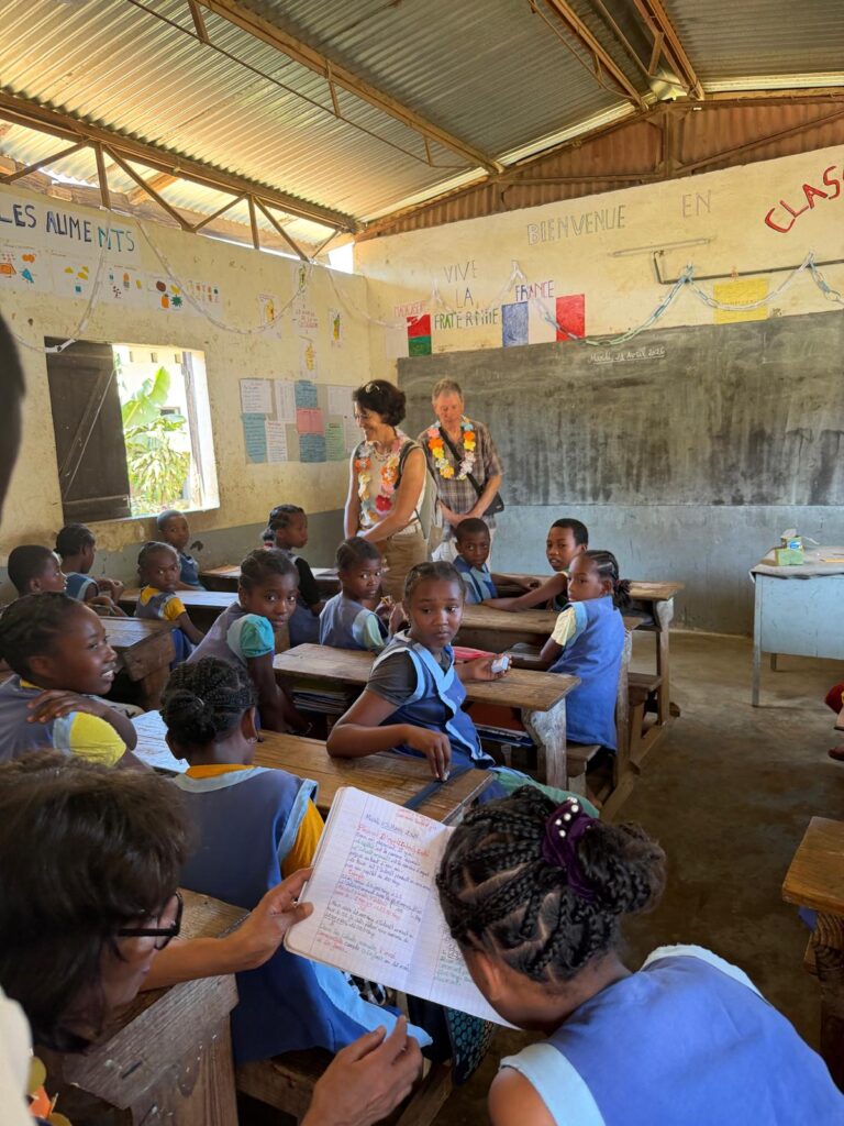 Monsieur Bonne-Chance, nouveau directeur, nous accueille. Les enfants entonnent chants et danses préparés depuis plusieurs semaines. Trois élèves de CM2 procèdent à la levée du drapeau, avant que l’hymne national malgache ne s’élève d’une seule voix. Moment de grande solennité, profondément émouvant, qui dit le respect accordé à l’école, à l’éducation et à cette rencontre.